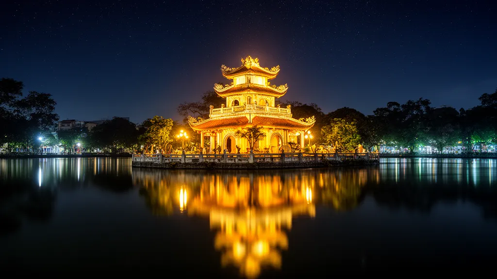 ハノイ中心部に位置するホアンキエム湖は、夜景スポットとして大変おすすめです。夜にはライトアップされた玉山祠や棲旭橋が水面に映り込み、幻想的な雰囲気を醸し出しています。美しい夜景を眺めながら、心ゆくまで散策を楽しめます